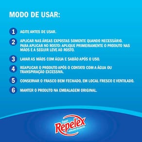 REPELENTE SUPER REPELEX LOÇÃO Repele o mosquito da dengue. Fragrância suave. Rápida absorção. Fácil de espalhar. Protege de insetos. Uso de dia e de noite. Dermatologicamente testado. Modo de usar: Ag