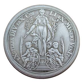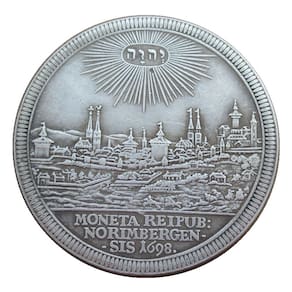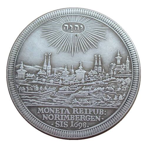 Material: ferro Peso: 35 g Tamanho: 4 x 0,3 cm Embalagem: 1 x CoinHistorical Replica Design — Apresenta uma gravura detalhada da paisagem urbana de Nuremberg com torres e arquitetura icônicas de 1698. Detalhe antigo do Sunburst — Decorado com um motivo solar radiante e inscrições históricas para um visual vintage autêntico. Acabamento em metal de alta qualidade — Feito de ferro durável com efeito prateado envelhecido, destacando detalhes intrincados em relevo. Tamanho de tela ideal — mede 4 cm de diâmetro, perfeito para colecionadores de moedas, entusiastas da história ou exibições decorativas. Colecionável europeu clássico — Uma moeda de reprodução única que representa a cultura e o artesanato europeus do século XVII.