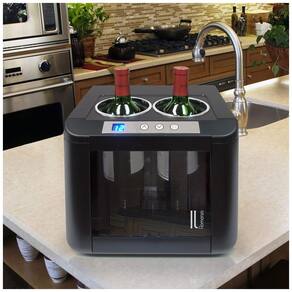 ÚNICO E CONVENIENTE O Vinotemp 2 Bottle Wine Chiller é uma adição inovadora à sua bancada. Este design aberto e autônomo pode acomodar facilmente duas garrafas de seu vinho tinto, branco ou espumante favorito. Com seu controle de temperatura ajustável, seus vinhos estão sempre na temperatura ideal para servir. CONFIGURAÇÕES DE TEMPERATURA PRECISAS Aproveite a conveniência do controle de temperatura digital, ajustável entre 5 19C, permitindo uma personalização precisa para atender às condições ideais de zenamento do seu vinho. CARREGADO COM RECURSOS Este refrigerador de vinho é ideal para entreter e preservar seus vinhos favoritos para desfrutar mais tarde. Seu sistema de resfriamento termoelétrico garante temperaturas consistentes, enquanto os controles da tela sensível ao toque oferecem ajustes sem esforço. O design de topo aberto permite o zenamento vertical de garrafas abertas, com um painel de controle digital para fácil personalização de temperatura. DESIGN DE ECONOMIA DE ESPAÇO A estrutura compacta e estreita deste refrigerador de vinho, medindo 29 centimetros de largura x 26,2 centimetros de profundidade x 26,2 centimetros de altura, foi projetada especificamente para manter 2 garrafas na posição vertical. Com aberturas de garrafa de 9,2 centimetros de diâmetro, é um ajuste perfeito para garrafas de vinho de tamanho padrão, economizando espaço valioso na bancada. OPERAÇÃO ELEGANTE E SILENCIOSA Com seu atraente corpo de gabinete preto e janela de visualização, este refrigerador de vinho não é apenas visualmente agradável, mas também opera silenciosamente. Graças à sua tecnologia de resfriamento termoelétrico, garante o mínimo de vibração, preservando a qualidade do seu vinho sem nenhum ruído perturbador