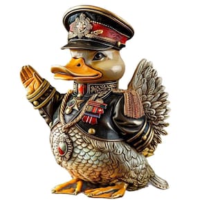 Material: Resina Tamanho: 6 × 6,5 × 7 cm Peso: 1000 g ['Design exclusivo do Officer Duck — Apresenta um pato vestido com um uniforme decorado em estilo militar, saudando com a asa levantada, criando uma peça ousada e bem-humorada para decoração de jardins ou exibição interna. ', 'Escultura altamente detalhada — Detalhes intrincados, como medalhas, dragonas, chapéu e textura de penas, fazem com que esta figura de resina se destaque como uma estátua ornamental colecionável cheia de personalidade. ', 'Artesanato durável em resina — Feita de resina de alta qualidade, esta figura ornamental é robusta, resistente às intempéries e adequada para ser colocada em mesas de pátio, estantes de livros, entradas ou detalhes de gramado. ', 'Ornamentos de exibição versáteis — ideais para adicionar personalidade à decoração da casa, mesas de escritório, áreas de varanda ou cenas de jardins ao ar livre, despertando conversas e interesse visual. ', 'Compacta e atraente — Medindo aproximadamente 6 × 6,5 × 7 cm, esta estátua compacta oferece forte presença sem ocupar muito espaço, perfeita para coleções temáticas ou decoração artística.']