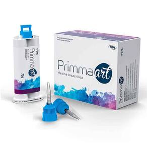 resina primma art 75g a2 - fgm é indicada para confecção de provisórios para procedimentos indiretos como: inlays, onlays, coroas, facetas e pontes; confecção de provisórios de longa duração; reembasamento de restaurações pré-fabricadas de resina, policarbonato ou metal; mock-up. Embalagem com 1 cartucho de 75g de resina + 10 ponteiras de automistura. Consistência com efeito reológico: viscosidade que promove o perfeito escoamento no preenchimento do molde facilitando a reprodução de detalhes. Oferece proporção precisa e consistente do produto propiciando procedimentos clínicos com reduzidas chances de erros e incorporação de bolhas. Compatível com ferramenta de aplicação universal a mesma utilizada na linha de silicone . Características: