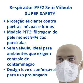 Respirador PFF2 Sem Válvula SUPER SAFETY CA 44241 Respirador semifacial filtrante PFF2 sem válvula, ideal para proteção das vias respiratórias contra poeiras, névoas e fumos. Atende à norma NBR 13698:2011 e é classificado como peça PFF2 de categoria D.1 b).