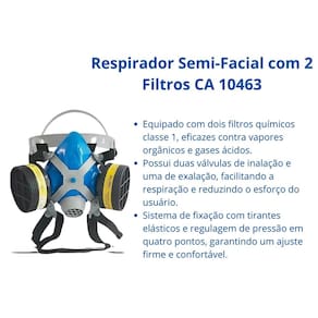 Características do Produto - Material: Elastômero sintético atóxico, proporcionando maciez e conforto. - Filtros: Acompanha dois filtros químicos Classe 1, eficazes contra vapores orgânicos e gases ácidos. - Válvulas: Duas válvulas de inalação e uma de exalação, facilitando a respiração. - Fixação: Tirantes elásticos com regulagem de pressão em quatro pontos, assegurando ajuste firme e confortável. - Certificado de Aprovação (CA): 10463, atendendo às normas de segurança vigentes.