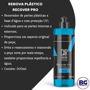 Restaurador de Plásticos Recover Pro 500ml Car Collection Bem Vindos a nossa Loja Despachamos o mais rápido possível Restaurador de Plásticos Recover Pro 500ml - Car Collection RECOVER PRO é um renovador de partes plásticas à base de água e com proteção UV, indicado para áreas internas e externas. -pode ser em plásticos internos e externos; -ph Neutro; -pronto para Uso; -renova e promove brilho; -protege contra as ações do tempo; Marca: Não Informado Ean: 7897520016306