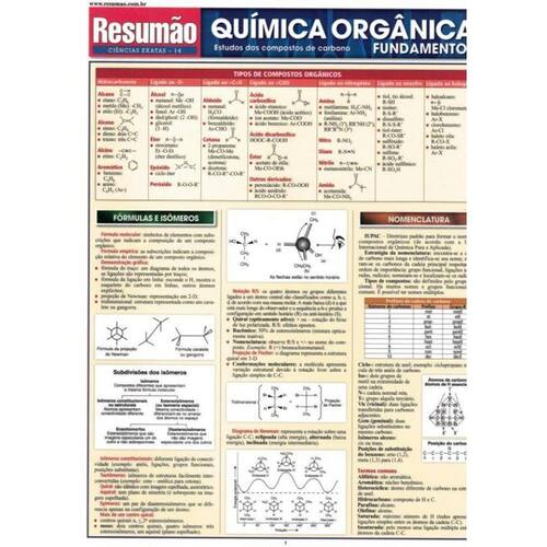 Fundamentos do estudo dos compostos de carbono; Tipos de compostos orgânicos; Fórmulas e isômeros; Nomenclatura; Ligação química em compostos orgânicos; Modelo de mecânica quântica - teoria do orbital molecular; Forças intermoleculares; Reações orgânicas - ácidos e bases, oxirredução, reações de adição, de substituição, de eliminação, de hidrólise, de condensação, reações iônicas e radicais; Espectroscopia e métodos instrumentais; Termodinâmica; e Cinética - velocidade da reação química.