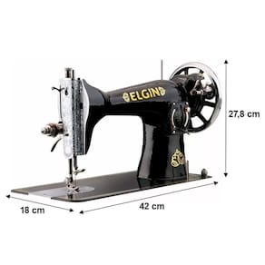 Máquina de Costura Reta Elgin B3 Dimensões Aproximadas do Produto - cm (AxLxP) - Máquina: 27,8 x 42 x 18 cm - Móvel: 91 x 43 x 24 cm Peso Aproximado do Produto (Kg) 12 Kg Máquina de Costura Elgin Doméstica Pretinha Robusta e resistente, a B3 possui corpo de ferro fundido e eixo de transmissão em aço. Faz costura reta com regulagem do comprimento do ponto e costura para trás. Possui enchedor de bobina. Seu móvel é um modelo tradicional, com 2 gavetas e pés de ferro MAQUINA DE COSTURA B3 C/ MOVEL 17 PC E BATTY