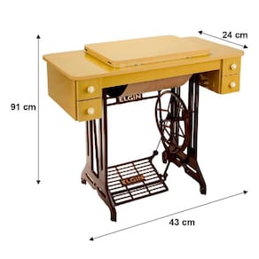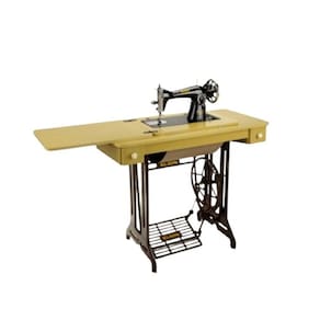 Máquina de costura reta doméstica com corpo em ferro fundido e eixo de transmissão em aço. Realiza costura reta com regulagem de comprimento e costura para trás. Inclui enchedor de bobina. O móvel é tradicional com 2 gavetas e pés de ferro.Funções
