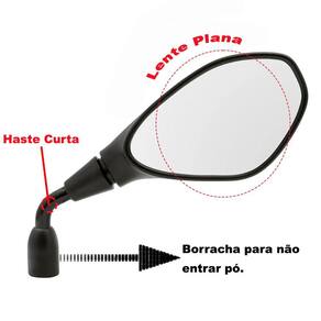 - Lente Plana; - Haste Curta Preto; - Maior campo de visão ao condutor; - Instalação simples; - Fixo (sem giro); - Encaixe perfeito; - Acompanha Borrachas de Acabamento (Guarda Pó)