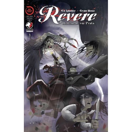 Revere: Revolução em Prata - Abril de 1775. Quando um assassino sobrenatural persegue os cidadãos de Boston, o renomado ourives e caçador de monstros Paul Revere é chamado para combater o mal. Enquanto rastreia pistas sobre a identidade do assassino, os primeiros tiros da Revolução são disparados, e Revere se vê lutando numa guerra em duas frentes em uma luta para salvar sua família. Revere então terá que enfrentar um bando de saqueadores de Casacos Vermelhos foras-da-lei liderados por um general sanguinário, resgatar uma donzela em perigo, e salvar uma alma perdida de demônios do passado. Tudo isso prepara o cenário para uma batalha climática na Old North Church, onde inimigos se tornam aliados em um esforço para salvar a terra desse terror indescritível. No fim, Revere acredita que o destino de sua amada esposa esteja nas mãos do único lobisomem que ele não conseguiu matar Originalmente publicada nos Estados Unidos pela editora Alias e Crash Comics, Revere chega agora paras os leitores brasileiros.