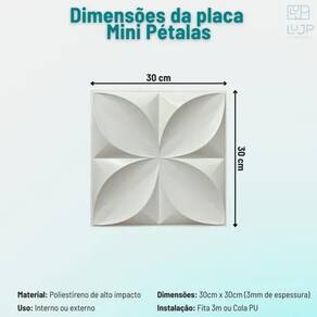 Revestimento 3d Parede Placa Pvc 30x30cm Kit 25un + Fita 3m Modelos: Branco Quantidade: 25 Placas Material: Poliestireno Alto Impacto Modelo: Mini Pétalas Cor: Branco ou preto com acabamento fosco e corte a laser. Espessura: 0.3mm Tamanho: 30cm x 30cm Nossas placas de poliestireno são exclusivas com corte a laser, oferecendo um acabamento fosco único no mercado, totalmente diferente do que você já viu. Fáceis de instalar, resistentes e adaptáveis, nossas placas transformam seus espaços com praticidade e estilo Instalação fácil, sem necessidade de profissional. Material resistente, com relevo que não amassa nem afunda. Instalação limpa, sem quebra-quebra. Ideal para paredes com umidade, mofo, textura, madeira e azulejo. Perfeito para ambientes internos e externos. Lavável para manter sempre como novo. de durabilidade por 10 anos. Dispensa pintura, economizando tempo e dinheiro. Fácil instalação com fita 3M, cola de contato ou cola PU. Cortes precisos feitos a laser para um resultado impecável. Transforme seu espaço com praticidade e estilo Área externa: Instalação com cola de contato e pintura obrigatória com tinta a base de água Área interna: instalação com fita dupla face, cola pu ou cola de contato e pintura opcional. A cor das placas nas fotos é igual à cor real do produto Resposta: As placas são na cor branca ou preta. Porém você pode aplicar tinta a base de água na cor de sua preferência, após a instalação. Posso colar as placas na parede com textura Resposta: Sim, você pode colar as placas em paredes com textura, desde que não seja chapiscado, mas é importante usar um adesivo de montagem adequado para garantir uma fixação segura. Qual é o peso de cada placa As placas acompanham fita dupla face Resposta: Sim, esse anuncio já acompanha a fita dupla face 3m para facilitar sua instalação As placas se encaixam conforme o vídeo Resposta: Sim, nossas placas são projetadas para se encaixar de forma fácil e eficiente, conforme mostrado no vídeo demonstrativo. Preciso de uma quantidade maior do que a disponível no anúncio. Posso encomendar mais Resposta: Sim, se precisar de uma quantidade maior do que a disponível, basta solicitar e nós calculamos a quantidade de acordo com as medidas fornecidas e indicamos outro anúncio correspondente para efetuar a compra. Posso usar as placas 3D em áreas externas descobertas Resposta: Sim, nossas placas são adequadas para uso em áreas externas descobertas, desde que instaladas corretamente e de acordo com as orientações do fabricante. Elas são resistentes a condições climáticas, mas recomendamos consultar as especificações de cada modelo para garantir a durabilidade ideal.