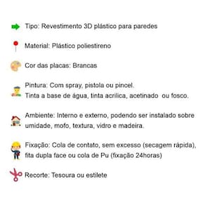 -instalação fácil, sem necessidade de profissional. -material resistente, com relevo que não amassa nem afunda. -instalação limpa, sem quebra-quebra. -ideal para paredes com umidade, mofo, textura, madeira e azulejo. -perfeito para ambientes internos e externos. -lavável para manter sempre como novo. -garantia de durabilidade por 10 anos. -dispensa pintura, economizando tempo e dinheiro. -fácil instalação com fita 3M, cola de contato ou cola PU. -cortes precisos feitos a laser para um resultado impecável. -transforme seu espaço com praticidade e estilo