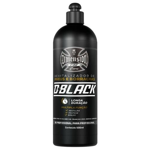 Revitalizador de Pneus e Borrachas D Black 500ml Dimension Produto indicado para revitalizar e condicionar pneus e borrachas, formulado para garantir um excelente efeito hidrofóbico, aspecto de novo e brilho acetinado por muito tempo. D BLACK é um produto com aplicação simples e direta. Cuidadosamente desenvolvido para revitalizar e proteger por mais tempo, sem atrair sujeiras e insetos. Promove brilho duradouro e exepcional hidrorepelencia. Após sua cura, o produto não sai em contato com a água, durando semanas.