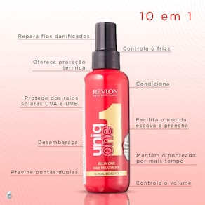 Com o Leave-in Revlon Uniq One os fios ficam hidratados instantaneamente, fortalecidos e sem frizz. Além disso, conta com proteção térmica e da cor, deixando o cabelo com brilho, suave e sem pontas duplas.