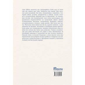 John Milton escreveu em Areopagitica (1644) que os livros não são objetos sem vida, tampouco são inertes. Eles circulam pela sociedade. São lidos, interpretados e debatidos. Carregam ideias, projetos, perspectivas e críticas. Levam consigo a inventividade daqueles que os fabricaram. Os autores, sem dúvida, são fundamentais, mas outros personagens são igualmente imprescindíveis na composição desses objetos multifacetados. Revisores, compositores, tipógrafos, editores, encadernadores e livreiros, nesse sentido, dão forma aos textos. Nenhuma obra existe fora de seu suporte material, o qual depende de decisões, atividades e estratégias desses agentes. Suas ações, por consequência, também transformam esses sujeitos em autores dos textos que publicam. É dessa consideração que parte Revolução em papel e tinta. Examinando as atividades editoriais e comerciais de dois livreiros londrinos, Hannah Allen e Livewell Chapman, a obra discute como eles expressaram seus próprios anseios políticos e religiosos nas páginas que confeccionaram e difundiram durante o turbulento contexto da Revolução Inglesa. Marca: UFPR - UNIVERSIDADE FEDERAL DO PARANA