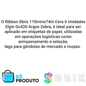 DESCRIÇÃO O Ribbon Sbrix 110mmx74m Cera 6 Unidades Elgin Gc420 Argox Zebra, é ideal para ser aplicado em etiquetas de papel, utilizadas em operações logísticas como armazenamento e seleção, tags para gôndolas de mercado e roupas.