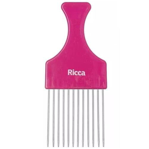 DESCRIÇÃO: Ricca 2407 Pente Cachos Metal. Cores sortidas. A cor será enviada aleatoriamente.AÇÃO/ATIVOS: O pente garfo de dentes largos é ideal para cabelos com cachos bem definidos que precisam de volume na raiz.Pontas arredondadas que não machucam o couro cabeludoMODO DE USAR: .Modo de uso: Para usá-lo, encaixe o pente na raiz horizontalmente e dê leves puxadinhas em direção ao comprimento, levantando a raiz. Depois, tire do cabelo pelo mesmo caminho, ou seja, ele deve ser tirado ainda paralelo à raiz. Quanto mais pentear o cabelo, da raiz para o crescimento, mais volume é adicionado.Pode ser usado apenas na raiz, com o cabelo seco, para construir o volume sem tirar a definição do comprimento.Para um visual com cachos bagunçados ou até mesmo um ?black power?, use o pente garfo repetidas vezes da raiz às pontas no cabelo seco.Faça sempre delicadamente para não correr o risco de quebrar os fios.ESTE ANÚNCIO CONTÉM: 01 Ricca 2407 Pente Cachos Metal