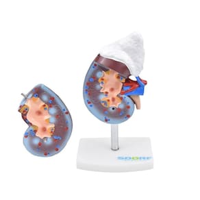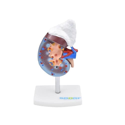 Modelo anatômico de rim com glândulas supradrenal, confeccionado em PVC, evidencia as estruturas internas e funcionais, feito com pintura a mão e cores realísticas; Com o modelo anatômico de rim com glândula supradrenal SD-5051/C, é possível identificar dentre outras estruturas: * Margem Lateral; * Margem Medial; * Hilo Renal; * Córtex Renal; * Pirâmide Renal; * Coluna Renal; * Cálices Maiores; * Cálices Menores; * Pelve Renal; * Ureter; * Artéria Renal; * Veia Renal; * Cápsula Renal Superior; * Cápsula Renal Inferior; * Glândula Adrenal;