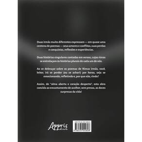 Duas irmãs muito diferentes expressam — em quase uma centena de poemas — seus amores e conflitos, suas perdas e conquistas, reflexões e experiências. Duas histórias singulares contadas em versos, cujas rimas se entrelaçam às histórias plurais de cada um de nós. Ao se debruçar sobre os poemas de Rimas irmãs, você, leitor, irá se perder (ou se achar!) por horas, seja se emocionando, refletindo e, por que não, rindo? Assim, de “alma aberta e coração desperto”, esta obra convida ao encantamento de acolher, sem pressa, as doces surpresas da vida! Marca: Não Informado