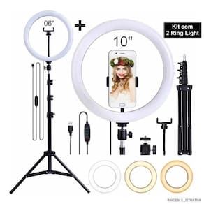 Ring light 10' + ring light 6'' kit iluminador pró de led para make maquiadora blogueira live youtuber fotografiaCom certeza você tem visto como tem aumentado o uso de vídeos e fotos profissionais nas redes sociaisNão é mesmoO segredo além de ter uma boa câmera é cuidar da iluminação, e pra isso estamos com esses 2 iluminadoresRing light completos para você usar nas suas mais variadas configurações, sejam elas para vídeos e tambémPara fotos, profissionais ou amadoras.Esse kit de ring light pró, vem completo pois vai nesse kit um ring ligth pró de 10 e um ring light pró de 6Com ele você terpa com toda certeza a iluminação certa para seus vídeos e fotos em qualquer lugar e aQualquer hora.Para você que adora arrasar naquela make perfeita e marcante, com esse kit com os dois ring lightsVocê poderá caprichar nas suas maquiagens sem medo de errar, pois ele tem além de 3 intensidade de luz,Ainda tem 3 tonalidades de iluminação que vai desde luz quente até luz fria, sabe o que é melhor, suaIluminação é todo em leds de alta intensidade.Esse kit acompanha várias peças para você usar da forma que desejar com seu celular, seja em qualquerUm dos ring lights, além disso ele tem seus tripés que podem ser conectados em ambos.Esses ring lights tem uma luz suave e quase sem sobras devido ao formato circular.Sua luz produz resultados espetaculares em tons de peles, tornando-o ideal para fotografia de retratos em que deseja-se destacar a pele,Maquiagem, corte de cabelo e até fotos de produtos e paisagens.Você pode ajustar o ângulo da iluminação por possuir um suporte articulado.Como ele tem conexão usb você pode ligar os seus ring lights em qualquer entrada usb do seu computador,Também pdoe ser usado com seu carregador de celular e até com powerbank.Diferenciais:. Controle de temperaturas de 3500k à 5500k.. Suportes de celular ajustável. Alimentação por usb 5v. 3 tons de de luminsidade quente, frio, neutro. Ajuste dos níveis de intensidade da luz. Ajuste suave do brilho e temperatura do brilho com um controle. Sem radiação ultravioleta e infravermelha, baixo calor, segurança completa e respeito pelo meio ambiente. Alimentação: 5v usb Especificações técnicas ring light 10. Anel de luz led. Tamanho 26cm = 10 polegada. Potência: 15 w. Tensão: dc 5 v. Quantidade de leds 120un. Temperatura 2.700k á 5500k. Alimentação usb. Comprimento do cabo aproximado: 1,90m. Pode ser utilizado fonte carregador de celular até 5vItens inclusos:. 01 anel de luz 10 polegadas (26 cm x 26 cm). Suporte para celular. 01 tripé 2,10mtsEspecificações técnicas ring light 6. Diâmetro: 16 cm. Alimentação: 5v usb. Comprimento do cabo aproximado: 1,90m. Temperatura de cor: 3200k - 5500k ajustável. Ângulo regulável: simItens inclusos:. 01 iluminador circular. 01 mini ballhead. 01 mini tripé. Suporte para celularImportante;. 30 dias de garantir contra defeito de fabricação.Todos os itens são testados antes do envio, evitando assim o envio de produtos defeito de fabricação.