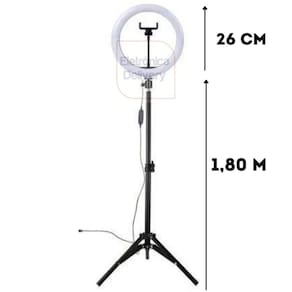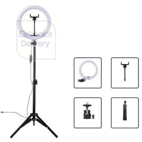 Especificações: Diâmetro do ring light: 26 cm Alimentação: 5v USB Comprimento aproximado do cabo: 1,70m Comprimento aproximado do tripé: 1,80m Temperatura de cor: 3200k - 5500K ajustável 3 Cores disponíveis: Branco Frio, Branco Neutro e Branco quente.
