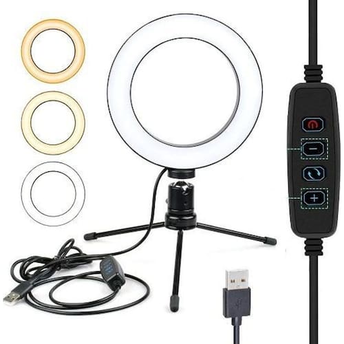 Ring light iluminador profissional luz led flash 16cm 10 polegadas selfie makeup foto vídeo youtuber 3 cores tripé mesa Ring light led com tripé de mesa com eletrônica a . Completo,de qualidade e com eletrônica.Acessório perfeito para melhor qualidade de seus vídeos e fotos. Iluminação multiuso forte e continua para utilização em lives, fotos, vídeos, maquiagem, estética, salões e muito mais.Iluminador ring light de 16 centímetros 6,5 polegadas , desenvolvido para maquiadores, fotógrafos, cinegrafistas, youtubers e etc, que buscam uma ótima maneira de iluminar com perfeição. Ring light led é um iluminador com ajuste de até 10 níveis de intensidade de luz, 03 tonalidades de cor, quente, fria e mesclada quente e fria ao mesmo tempo .O encaixe do ring light é através de encaixe padrão de tripés de rosca. O mini tripé também serve para utilizar em outros equipamentos de até 1kg de peso, como projetores, celulares e etc.É recomendado e extremamente eficaz para a macro fotografia, fotografia médica, odontológica, científica, hobby e para a iluminação/fotografia de produções de maquiadores. A alimentação do iluminador é através de cabo usb não acompanha adaptador de tomada e não possui bateria interna recarregável , você pode utilizar um adaptador de tomada de celular para ligar ou conectar no usb do computador ou outro equipamento que forneça 5v usb. O cabo usb deverá estar sempre ligado para funcionar. Características:- alimentação: usb- voltagem: bivolt- tipos de luz: quente, fria e mesclada.- temperatura da cor: 3500k / 5500k- dimensões aproximadas do led axlxp : 16x16x1,5cm- altura aproximada do tripé com encaixe articulado: 19,5cm- material do tripé: ferro- tamanho aproximado do cabo: 2m- cabo com controle de liga/desliga, tipo de cor e intensidade de luz. O kit contém: 1 anel de led 16cm 1 encaixe articulado 1 tripé Temos á . Postamos em até 24 horas úteis.