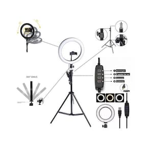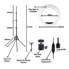 Embalagem contém: 1 - Ring Light 10 26cm ; 1 - Adaptador de celular; 1 - Tripé altura máxima de 2,1m ; 1 - Controle de intensidade de iluminação.