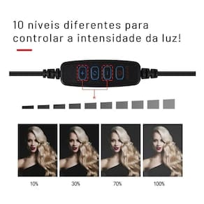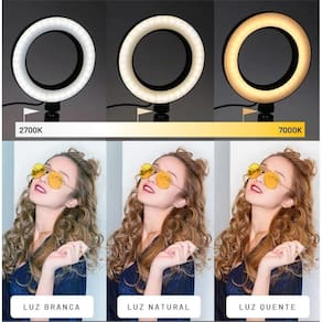 Iluminador ring light by sabrina sato Modelo: 320a - 30cm Com controle remoto Iluminador profissional ring light by sabrina sato para gravações e selfies. Suas fotos e vídeos com qualidade profissional Permite regular até 3 tipos de cores para a luz, branco frio, branco neutro e branco quente Possui sistema que controla a intensidade da luz em até 10 níveis diferentes O iluminador profissional ring light possuí uma haste flexível (suporte de celular) ao meio do led para prender o celular, proporcionando conforto para bater suas fotos e vídeo tanto verticalmente, horizontalmente, pra cima ou para baixo, por ser flexível você pode deixar na posição desejada Acompanha tripé com altura máxima de 210 cm total. Qualidade e profissionalidade em seus vídeos e fotos. O que contém na embalagem - 01 aro circular ring light com 30cm de diâmetro (12 polegadas) - 01 controle remoto - 01 tripé com altura máxima 210 cm e mínima 65cm - 01 haste flexível porta celular - 01 cabo usb com controle de tom/luz integrado - 01 tripé suporte de celular 360 Ficha técnica: 1) potência: 12w 2) diâmetro do aro/luz: 30cm / 12 polegadas 3) led: 160pcs, 2835 led chip 4) ctt: 2700 - 7000k 5) ra/cri: 80 6) imput: dc 5v/1a (5v/2a) 7) cor do corpo: preta 8) materiais: abs + pc 9) certificados: ce, rohs, fcc Aviso: entrada do produto usb é compatível com fonte de celular. Todos nossos produtos são originais, pronta-entrega e acompanham nota fiscal e manual de montagem e uso