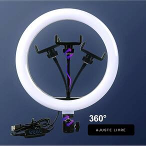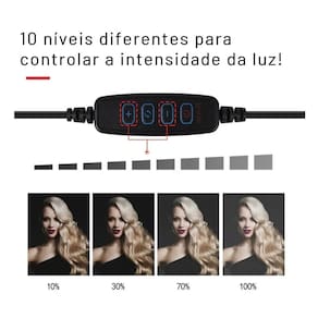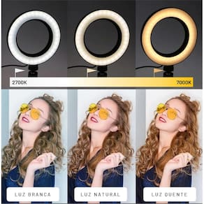 Iluminador ring light by sabrina sato Modelo: 320a - 30cm Com controle remoto Iluminador profissional ring light by sabrina sato para gravações e selfies. Suas fotos e vídeos com qualidade profissional Permite regular até 3 tipos de cores para a luz, branco frio, branco neutro e branco quente Possui sistema que controla a intensidade da luz em até 10 níveis diferentes O iluminador profissional ring light possuí uma haste flexível suporte de celular ao meio do led para prender o celular, proporcionando conforto para bater suas fotos e vídeo tanto verticalmente, horizontalmente, pra cima ou para baixo, por ser flexível você pode deixar na posição desejada Acompanha tripé com altura máxima de 210 cm total. Qualidade e profissionalidade em seus vídeos e fotos. O que contém na embalagem - 01 aro circular ring light com 30cm de diâmetro 12 polegadas - 01 controle remoto - 01 tripé com altura máxima 210 cm e mínima 65cm - 01 haste flexível porta celular - 01 cabo usb com controle de tom/luz integrado - 01 tripé suporte de celular 360 Ficha técnica: 1 potência: 12w 2 diâmetro do aro/luz: 30cm / 12 polegadas 3 led: 160pcs, 2835 led chip 4 ctt: 2700 - 7000k 5 ra/cri: 80 6 imput: dc 5v/1a 5v/2a 7 cor do corpo: preta 8 materiais: abs + pc 9 certificados: ce, rohs, fcc Aviso: entrada do produto usb é compatível com fonte de celular. Todos nossos produtos são , pronta-entrega e acompanham e manual de montagem e uso Marca: Lila Make Up Ean: 7907111411042