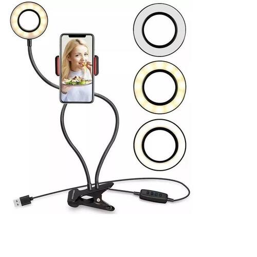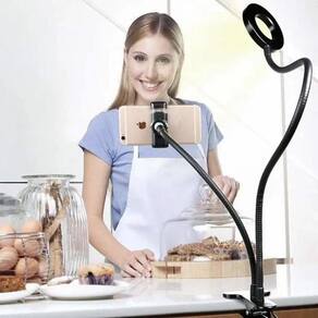 Ring light suporte prender celular iluminação foto e video As duas hastes do produto são flexíveis feitas em material metálico muito resistente para permitir o melhor posicionamento possível tanto de seu celular quanto do foco de luz. Desta forma você obtém o melhor resultado em seus vídeos e em suas selfies. É perfeito para aqueles que já se cansaram de segurar o telefone. Navegar pela internet, assistir netflix, gravar vídeos, tirar fotos ou qualquer outra tarefa de telefone intensivo que deixam seus braços cansados depois de um tempo e simplesmente não é confortável por longos períodos de tempo. Este suporte de telefone fica apoiado em sua mesa para que você obtenha a melhor visão enquanto estiver assistindo ou navegando na internet. Nunca mais tenha braços cansados. Adapta-se a qualquer telefone. Ajustável para obter a melhor posição. Suporte giratório A peça do suporte do telefone pode ser ajustada para ficar na melhor posição. Também tem um botão para apertar seu ajuste, dando-lhe a posição mais confortável. Estrutura flexível e ajustável O eixo é totalmente flexível e você pode criar formas incríveis, como suportes ou bastões de selfie com ele. É realmente um braço de soluções que pode se moldar em vários formatos úteis que melhorarão e muito a forma que você utiliza o seu telefone. Informação técnica: Material: abs Compatível com aparelhos samsung, , motorola entre outras marcas. Projetado com duplo grampo e o dobro de segurança para seu aparelho. Com o suporte articulado flexível pescoço de ganso, você pode ajustar livremente o melhor ângulo de visão, inclusive gira 360 graus. O grampo de fixação tem abertura máxima 9.4 cm, interior macio com almofada de borracha para fornecer a segurança extra para seu aparelho. Pode ser utilizado na cama, na mesa, na cozinha, no escritório e em qualquer superfície onde possa prender o grampo, ou seja, você irá fixá-lo em qualquer lugar que queira ficar. Dimensões aproximadas: Braço flexível: 70 cm Gancho da mesa abertura máxima: 7.4 cm Predendor celular abertura máxima: 9.4 cm Marca: Não Informado Ean: 6015244354356