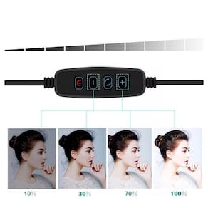 Ring light de led é um iluminador com ajuste de até 10 níveis de intensidade de luz, 03 tonalidades de cor, quente, fria e mesclada ou natural quente e fria ao mesmo tempo , alimentado através de um cabo usb, devendo estar sempre conectado a uma fonte de energia para acender.
