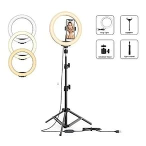 5 - O tripé possui 65cm de altura e pode ser estendido para até 2,10m. O suporte de celular tem 5,5cm de largura e se estende para até 8,5cm. O Ring Light tem 26cm de diâmetro (10 polegadas). O cabo da Ring Light tem aproximadamente 1,9m.