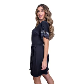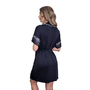 Robe de Luxo Microfibra Com Renda Hobby Roupão Roupa de Dormir com Cinto Lingerie Sexy para Noite Especial Manga Curta- PRETO - Preto - P