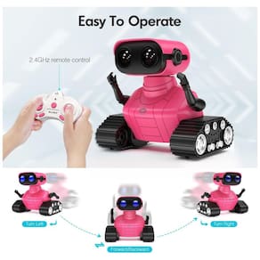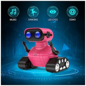 Robô Multifuncional: Os olhos LED acendem ao ligar o robô, e você pode fechá-los ou fazê-los piscar usando o controle remoto. Função de voz: Ao ligar, o robô começa a falar em sua própria linguagem e pode cantar 3 músicas, que podem ser trocadas pelo controle remoto. Trilhos de tanque: permitem que o robô se mova para frente, para trás, para a esquerda e para a direita. Quando ativado no modo demo, o robô começa a dançar.