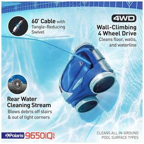 O Polaris 9650iQ Sport é um limpador robótico de piscina 4WD que oferece desempenho de limpeza premium. Com o aplicativo iAquaLink, você pode controlar o limpador facilmente a partir do seu telefone, sem precisar estar na piscina. O 9650iQ Sport vem com uma conexão WiFi integrada que permite o controle do aplicativo iAquaLink em tempo real e solução de problemas a partir do seu dispositivo inteligente. O limpador é compatível com piscinas enterradas de até 18,24 Metros e vem equipado com um cabo de 21,28 Metros com giro para redução de emaranhados e um recipiente extragrande de 5L para detritos. O 4Wheel Drive ultrapassa obstáculos e não fica preso, enquanto o giro estanque do baixa torque evita que o cabo se enrosque durante a operação. O caddie premium também está incluído.