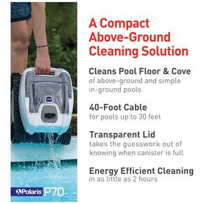 O Limpador robótico de piscinas acima do solo Polaris P70 F70 é uma excelente opção para limpar o chão e a enseada da piscina. Este produto é capaz de limpar completamente o fundo e a enseada de piscinas acima do solo e simples subterrâneas, além de esfregar essas áreas. O aspirador ciclônico permite a captura de sujeira e detritos sem perder a sucção, enquanto o recipiente de filtro de limpeza fácil pode ser facilmente removido, destravado, agitado e borrifado com a tampa transparente, eliminando a necessidade de adivinhar quando esvaziar o recipiente. Com design compacto e leve, este limpador é fácil de manusear para uma limpeza poderosa de piscinas acima do solo e simples no subsolo. O tempo de limpeza é de apenas 2 horas, tornando o uma opção eficiente em termos de energia.