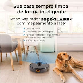 O ropo Glass 4 é o único no Brasil com Mapeamento a Laser 4.0 que varre, aspira, passa pano e esteriliza sua casa com a exclusiva Lâmpada Ultravioleta, auxiliando na eliminação de microorganismos causadores de doenças presentes no piso da casa, proporcionando mais saúde para toda a sua família.Projetado com recursos avançados para tornar sua casa ainda mais inteligente e conectada, ele constrói um mapa de alta precisão dos ambientes, memoriza-os e você pode ver o resultado na tela do seu celular.E isso não é tudo o que o ropo Glass 4 pode fazer!Com 9,6 cm de altura, o robô consegue alcançar lugares onde o aspirador comum não chega. No modo de limpeza úmida, o ropo possui a nova Função Esfregar, que passa pano simulando o movimento humano. Além disso, ele tem a capacidade de ajustar a dispersão de água para o pano em três modos. O reservatório de água possui ainda um compartimento para resíduos secos, varridos pela escova central com tecnologia V-Shape Hybrid.Pelo aplicativo você pode também selecionar cômodos específicos e enviar o ropo para o local desejado ou restringir áreas que você não queira que ele vá. Caso seu ropo Glass 4 fique sem bateria durante o ciclo de limpeza, ele irá automaticamente até a estação para recarregar e quando estiver com a bateria completa, retomará a limpeza de onde parou!E tem mais! Notificações por voz, Controle Remoto e por Aplicativo, Compatível com Assistentes Virtuais, Limpa diversos tipos de piso, Barreira virtual, Função Full-Go, Gestão de mapas, Modo silencioso, Limpeza de cômodos específicos, Sensores antiqueda, Sensores anti-impacto, Agendamento de Limpeza, Recarregamento Automático e Suporte e Assistência 100% Nacional.