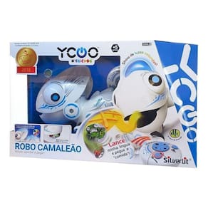 Robô Camaleão Controle Remoto DTC SilverlitA DTC acaba de trazer o ganhador do prêmio Toy Award 2018 o Robô Camaleão, as crianças vão se divertir O Robô Camaleão lança a língua para a fora e pega a comida A caça possui 3 etapas, a primeira é levar o robô camaleão até a comida, a segunda mirar no alvo e a terceira apertar Pegar no controle remoto. O Robô Camaleão possui o corpo iluminado por LED com múltiplas mudanças de cores Seus olhos e cauda se movem quando anda Sua língua é acionado por controle remoto e sua boca é a caixa de tesouro. Detalhes: Possui controle infravermelho, efeito de luzes brilhantes e controle com 4 direções. Idade Recomendada: Acima de 05 anos. Tamanho aproximado: 13 centímetros de altura, 8 centímetros de largura e 25 centímetros de comprimento. Silverlit Robô Camaleão Branco e Amarelo - DTC O pequeno e bonito camaleão com os grandes olhos largos e os enfeites semelhantes a robô no corpo tornar-se rapidamente os preferidos de todas as crianças da pré-escola. O Robô Camaleão pode