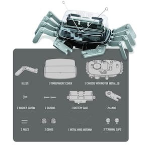 Itens inclusos: 8 pernas, 1 capa transparente, 1 chassi com motor instalado, 3 parafusos, 1 caixa de bateria, 2 engrenagens, 2 eixos, 2 garras, 1 antena metálica, 2 pinos conectores. Dimensões aproximadas da caixa: 24 x 17 x 6 cm. ATENÇÃO: Observe atentamente a idade recomendada para o brinquedo. Pode conter partes pequenas que podem ser engolidas e perigosas. As fotos são para ilustrar o produto. Certificado INMETRO CE-BRI-SGS N-0060-80 NM 300-2002. Código do produto: K00-03357. Código de barras EAN: 4893156033574 Ean: 4893156033574