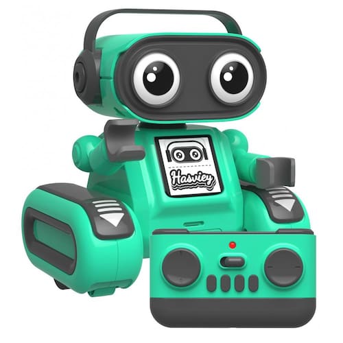 O robô Hasviey é um brinquedo eletrônico recarregável com controle remoto, indicado para crianças a partir de 3 anos, formado por duas partes: a unidade superior com cabeça e braços articulados e a base com rodas para deslocamento. Os olhos em LED acendem ao ligar o robô e podem ser ajustados para diferentes modos de iluminação pelo controle, enquanto a base realiza movimentos para frente, para trás, rotações e giros de 360 graus. O modo de demonstração automática aciona sequências de dança combinadas com música, transformando o uso em uma atividade de movimento e ritmo.