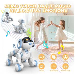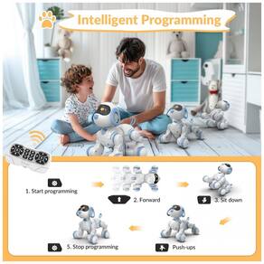 O modo de programação permite registrar uma sequência de movimentos, como andar para frente, para trás, virar à esquerda e à direita, que são reproduzidos na ordem definida pela criança. O robô possui danças e músicas integradas, podendo executar diferentes coreografias quando acionado pelo controle, com olhos em LED que reforçam a expressão visual durante os movimentos. A articulação na região da cintura permite imitar poses típicas de animais, aumentando as possibilidades de gestos durante a brincadeira.