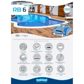 Robôs de limpeza de piscina de até 12m RB6Robô RB6 Sodramar para limpeza de piscinas de até 12m Chegou o incrível Robô para limpeza RB6 Sodramar, ele traz o que há de mais moderno no mercado mundial diretamente para sua Piscina, com ele o trabalho de limpeza da sua piscina resume-se em colocar o Robô na água e apertar apenas um botão e pronto. Ele é capaz de aspirar e escovar totalmente uma piscina de até 12m de comprimento em até 3 horas, seu filtro interno possui alta capacidade de retenção de sujeiras e micro partículas, sua escovação é muito eficiente escova totalmente paredes e piso da piscina. O RB6 é ideal para quem não quer ter trabalho com a limpeza da piscina ou não gosta de ter prestadores de serviço em sua casa fazendo este trabalho, além disso a aspiração utilizando o Robô é ecologicamente correta, pois não desperdiça água nem produtos químicos cloro como em alguns casos da aspiração tradicional. tenha em sua casa esta comodidade e não se preocupe o Robô RB6 possui 2 anos de garantia Sodramar.INFORMAÇÕES TÉCNICASPeso: 9kgAltura x Largura x Comprimento: 19 x 40 x 40 cmBivoltCiclo de limpeza: 3h Ean: 7899005618814