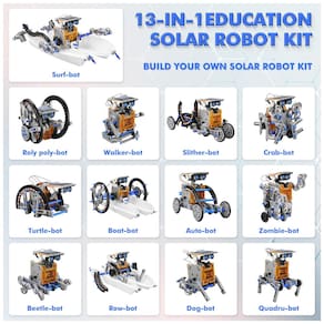 Este kit educacional permite que as crianças construam 13 tipos diferentes de robôs, que podem se mover em terra e água, seguindo um manual passo a passo. Inclui peças móveis e de conexão como engrenagens, placas, pneus e eixos, que podem ser facilmente desmontadas após cada construção.
