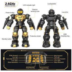 Versão atualizada Mais legal do que você imagina e mais resistente do que parece, este brinquedo robô tem os mais recentes estilos de formas e funções com um controle remoto de 2,4 GHz. Segurando s e escudos de proteção, ele está pronto para ser um fiel companheiro das crianças. Controle Remoto e Sensor de Gestos Este robô com sensor de gestos pode não apenas ser controlado pelo controle remoto, mas também pode avançar, retroceder, esquerda e direita de acordo com seus comandos de gestos. Programação Intelectual O brinquedo robô pode ser programado através do controle remoto para demonstrar um conjunto de ações criadas pela criança, como Vire à esquerda Vire à direita Deslize para frente Recuo, o que permite que a imaginação da criança corra solta enquanto lhes traz diversão ilimitada. Robô Inteligente Recarregável Este robô RC se tornará o melhor parceiro para seus filhos com a função de cantar, dançar, contar histórias. 1 hora de reprodução após carregar por 60 minutos. Você pode carregá lo facilmente usando o cabo USB Marca: Não Informado
