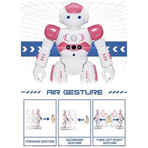 Este robô inteligente pode ser controlado tanto por um controle remoto infravermelho quanto por gestos manuais. Ele pode virar à esquerda, à direita, deslizar para trás e para frente conforme os comandos de gesto. Além disso, possui funções múltiplas, incluindo exibição automática e evasão de obstáculos. Os olhos do robô iluminam com LEDs azuis brilhantes quando ele se move.