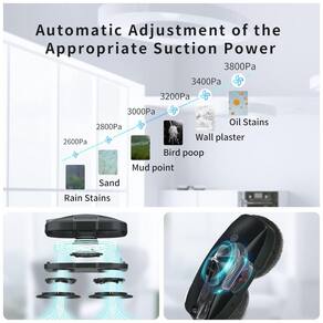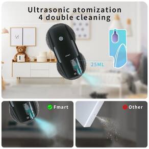 O limpador automático de janelas FMART apresenta uma inovadora sucção eficiente com conversão de frequência de 3800PA. A sucção do chassi é ajustada de forma inteligente de acordo com o grau de sujeira do vidro, proporcionando uma força adequada. Nota: Evite usar um pano molhado para limpar, pois isso pode afetar a sucção e causar escorregadio. Mantenha o vidro seco e evite usar em dias chuvosos ou quando o vidro estiver molhado ou úmido.