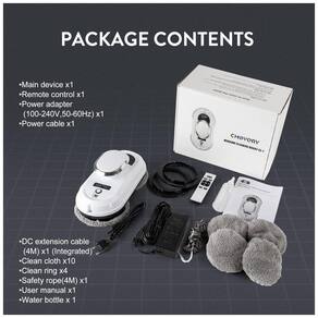 1 Robô limpador de janelas CL 1 1 Controle remoto bateria não incluída 1 Adaptador de energia 100 240 V, 50 60 Hz 1 Cabo de alimentação 1 Cabo de extensão CC 4M 1 Corda de segurança 4m 10 Almofadas limpas de microfibra 1 Manual do usuário 1 Garrafa de spray de água Marca: Não Informado