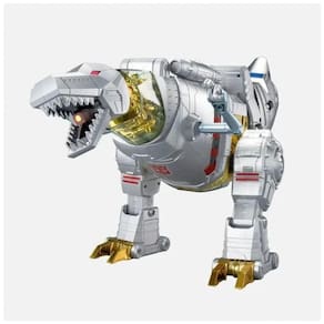 O Robosen Flagship Grimlock é um robô colecionável de última geração que se transforma automaticamente entre os modos dinossauro e robô, com controle por voz e aplicativo, equipado com 34 servomotores e mais de 150 clipes de áudio autênticos da série G1 dos Transformers.