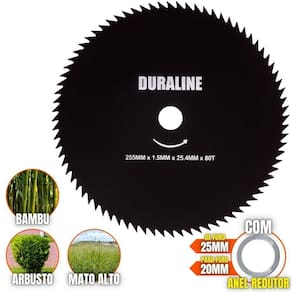 O DISCO DE CORTE 80 Dentes acompanha um anel de redução que pode ser utiizada para roçadeiras de furo 20mm ou 25mm, sendo feita em aço cromo vanádio que garante mais , desempenho e durabilidade. É uma lâmina balanceada, fazendo com que haja menor vibração, corte contínuo e suave, com mais conforto ao operador e mais longevidade para a roçadeira. Possui maior rendimento no trabalho e não precisa ser afiada antes do . É um disco multi pois pode ser aplicado para diferentes trabalhos, tendo em vista que pode serrar madeiras até 10cm, dentre elas esse modelo corta: Arbustos, Pequenas Árvores, Capim Grosso, Capim Elefante, Capim Guanxuma, Capim Annoni, Vassourinha, Bambu, Cana de Açúcar , Mato Alto, Capim Napier, Capim Sapê, Touceiras entre outros.