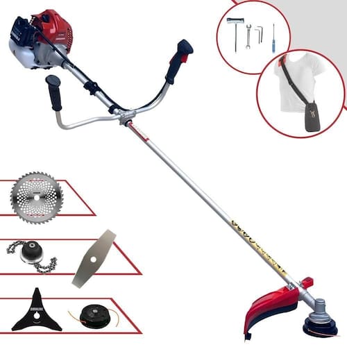 Com guidão ergonômico lateral, permite um alcance amplo e maior mobilidade, capaz de aumentar a produtividade diária. Possui motor 2 tempos á gasolina, de 52 Cilindradas; 2,5HP de potência que proporcionam maior performance e economia na operação. Seu conjunto de acessórios inclui kit de ferramentas, cinto de suporte almofadado, carretel de nylon e lâmina de corte 3 pontas.