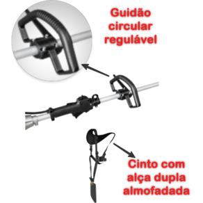 Possui guidão circular regulável e cinto com alça dupla almofadada, que confere maior conforto ao operador e melhor distribuição do peso do equipamento. Conta ainda com sistema de emergência caso seja necessário soltar a roçadeira, além de frasco graduado que facilita a medição/mistura de gasolina e óleo 2 tempos. Equipamento pronto para uso, pois acompanha lâmina três pontas e carretel com fio de nylon. Possui sistema de partida de fácil acionamento (Easy-start), que deixa o acionamento do retrátil mais suave na hora de dar a partida. Indicada para uso em residências, sítios, chácaras e condomínios, para limpeza e manutenção de jardins, poda de gramas, capim e ervas daninhas. No abastecimento, colocar gasolina misturada com óleo 2 tempos de boa qualidade, na proporção 25:1 (40 ml de óleo para 1 litro de gasolina). Diâmetro máximo da lâmina: 255 mm. Atenção: nunca toque na lâmina com o equipamento ligado, utilize carretel com fio de nylon e não lâminas em terrenos com risco de pedras.